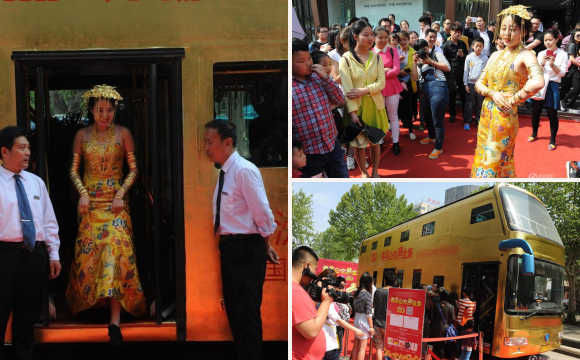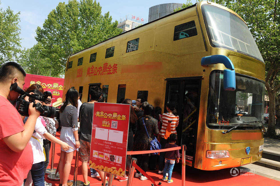 4月25日,一輛“黃金公交車”亮相山東濟(jì)南。據(jù)介紹,該公交車80%的部分都貼了金箔,“黃金美女”模特身上佩戴的黃金飾品價(jià)值兩百萬,公交車車內(nèi)掛滿了數(shù)千件黃金飾品,重達(dá)幾十公斤,總共價(jià)值500余萬。(來源:騰訊新聞 陳寧/CFP)