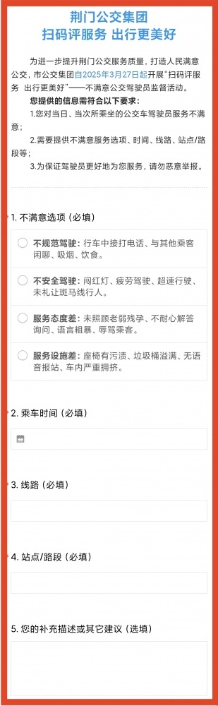 市民乘客可通過掃描公交車上的“服務(wù)監(jiān)督二維碼”,進(jìn)入“不滿意公交駕駛員監(jiān)督舉報(bào)”頁面,填寫詳細(xì)舉報(bào)信息(評價(jià)頁面如下)。