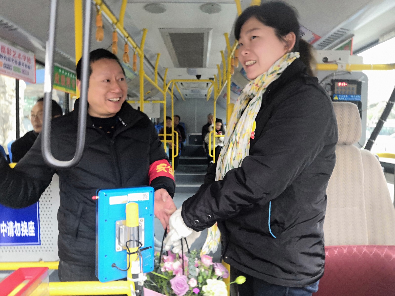“我代表公司全體男職工,祝你們節(jié)日快樂,永遠美麗??!這籃鮮花送給你~”公交信息技術(shù)部男職工羅皓這樣說道,并將一籃鮮花送到正在跑班的公交女駕駛員蘇純菊手中。面對這突來的鮮花和祝福,蘇純菊滿臉驚喜和溫馨,“謝謝,謝謝你們”在道謝聲中,關(guān)上車門,微笑著駛向下一站。