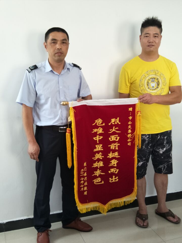 7月27日,荊門市旅行社出租汽車公司負(fù)責(zé)人及鄂H0A073的駕駛員專程來到荊門公交集團公司,為果斷義舉滅火的公交陳旭師傅送上了一面“烈火面前挺身而出,危難中顯英雄本色”錦旗。