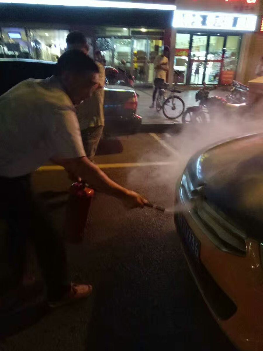 7月21日晚9時(shí)10分左右,公交集團(tuán)三公司2路車駕駛員陳旭駕駛鄂H0A073號行駛至金地廣場站,突然聽到馬路對面有人大聲疾呼“著火啦!救火!”,陳師傅忙停穩(wěn)車,只見對面一的士引擎蓋冒煙起火,他立即拿起公交車上的滅火器快跑到馬路對面,將出租車的火撲滅。