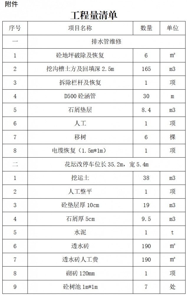 工程規(guī)模:排水管維修及修建停車(chē)位,具體內(nèi)容詳見(jiàn)工程量清單(附件)。